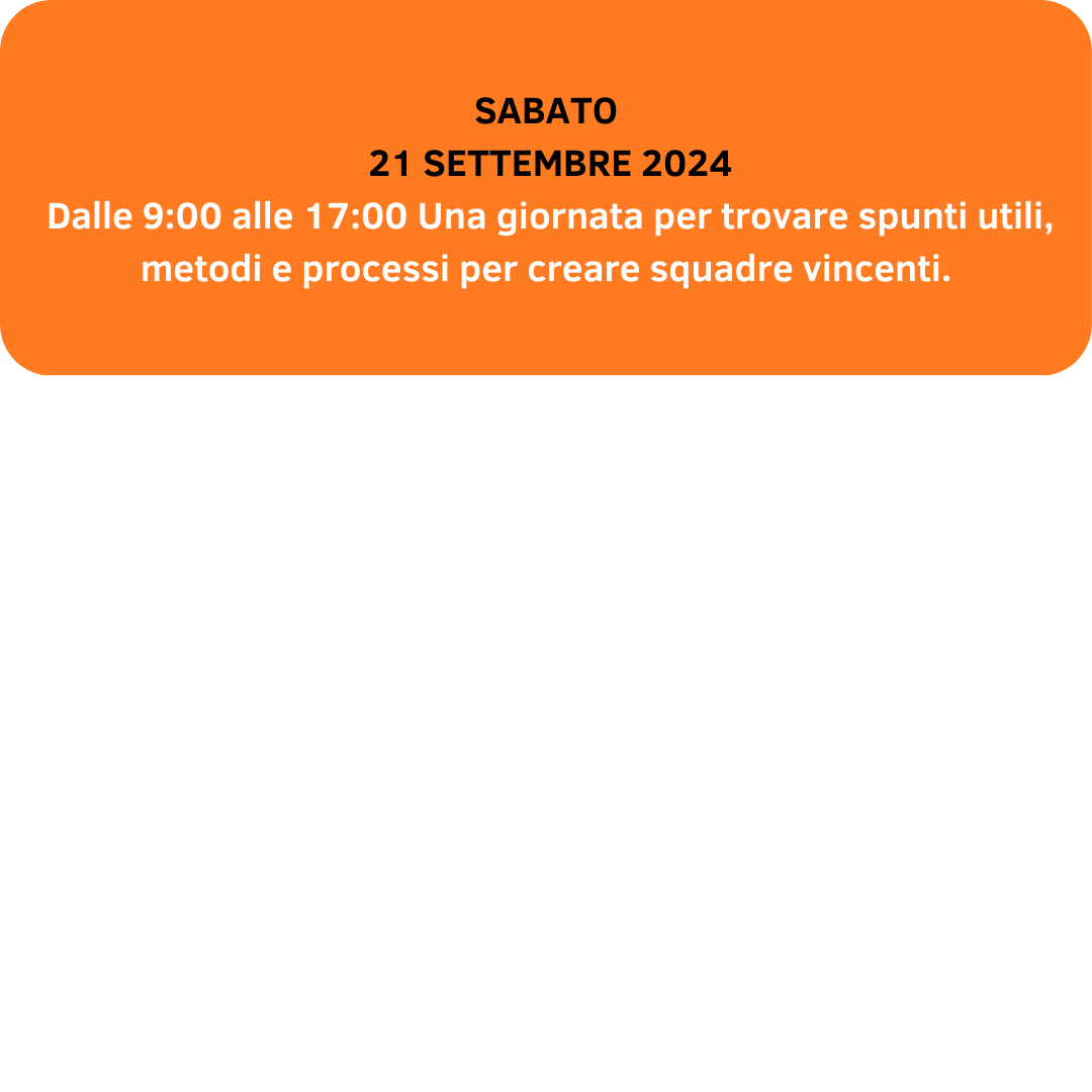 SQUADRE VINCENTI - Seguendo i principi che verranno spiegati durante la giornata, un team può diventare coeso e performante, contribuendo significativamente al successo e alla crescita dell'azienda. SQUADRE VINCENTI vuole fornire spunti utili, concreti, per raggiungere gli obiettivi. La formazione continua e lo sviluppo professionale sono investimenti cruciali per migliorare le competenze del team. Motivare e riconoscere i successi individuali e collettivi mantiene alto l'entusiasmo e l'impegno. Inoltre, promuovere la collaborazione e costruire fiducia reciproca crea un ambiente di lavoro positivo, dove tutti si sentono valorizzati.